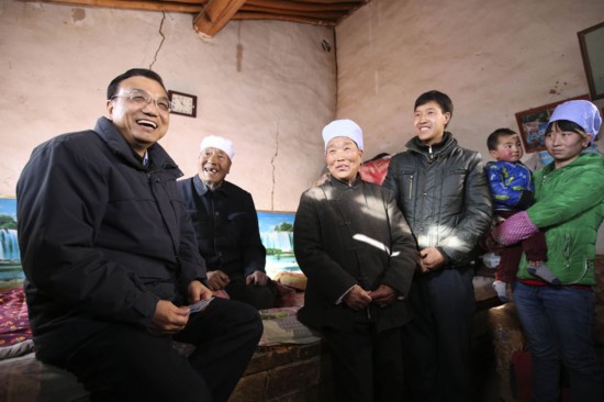 固原是革命老区、民族地区,也是集中连片特困地区。李克强沿着蜿蜒崎岖的山路驱车一小时来到最贫困的半子沟村,走进群众家中,详细了解低保水平,看病报销比例,拉饮用水要走多少里路。他登上陡坡与村民们亲切交谈,大家纷纷表示希望早日搬迁。李克强说,把贫困人口从自然条件恶劣的地方搬出去,是精准扶贫、拔掉穷根的重要方式,搬出去天地就宽了,就医、出行、上学的条件更好,可以生出好日子的“新根”。消除绝对贫困是“十三五”时期务必打赢的攻坚战,是必须补上的“短板”,要横下一条心,憋足一股劲,啃下这块硬骨头,不让贫困群众在全面小康路上掉队。