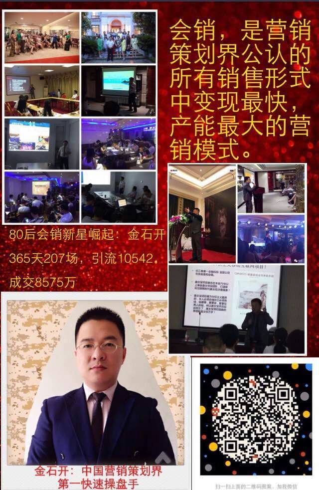 会销:顾名思义,就是机构策划和组织某种有主题有目的有意义的活动,邀约相对精准客户群体参加活动或会议,达到找出精准意向客户和获取直接下单客户的目的的一种模式。会销的好处在于现场成交,让客户当场下订单,付款拿货拿资源,快速达到双赢的局面。目前是最快速的销售模式,远远超过电销 而会销不是每个商家都可以做的,因为,一场会销需要经过严密的设计,策划,和组织,会销主持人除了要有卓越的口才,敏捷的反应力,渊博的知识面,把强大的表达能力,更需要有高超的控场能力,观察能力,调节气氛能力,把控突发事件能力。最后控制整个会销的流程把握能力。这一切,没有10年以上的深湛修炼功底,是无法胜任的。 而整个会销团队的组建,配合,培训和统一行动。也是整个会销过程中非常重要的。 目前,在长三角一带,最为著名的会销操盘手,非金石开先生莫属。金石开老师毕业于复旦大学,拥有法学经济学双学士学位,是会销界最有知名度,操盘能力最强,最快速的策划和执行机构。成功案例几百起,最著名的一场会销是一场苏州的会销,现场成交五套别墅。金石开老师把控全场能力非常强,可以做到把全场气氛自由调节,且引起人的消费冲动,最后做到排队刷卡。 且会销基本任何行业都可以做。尤其典型的招商会,加盟会,会员交流会,培训会,论坛沙龙,峰会都可以做成会销模式,现场刷卡模式。 目前据风投界对金石开操作的金石开在会销界的估值在1个亿。而据了解,金石开老师的出场费目前是5万左右,未来在半年内金老师的身价将达到10万一场。 据了解,金石开老师的杭州金团网络科技有限公司:目前是会销策划与执行第一快速操盘运营机构,是“互联网+会销”唯一强势机构公司。 |