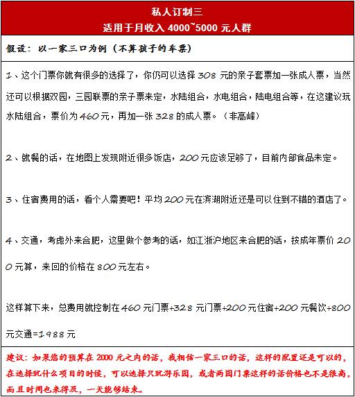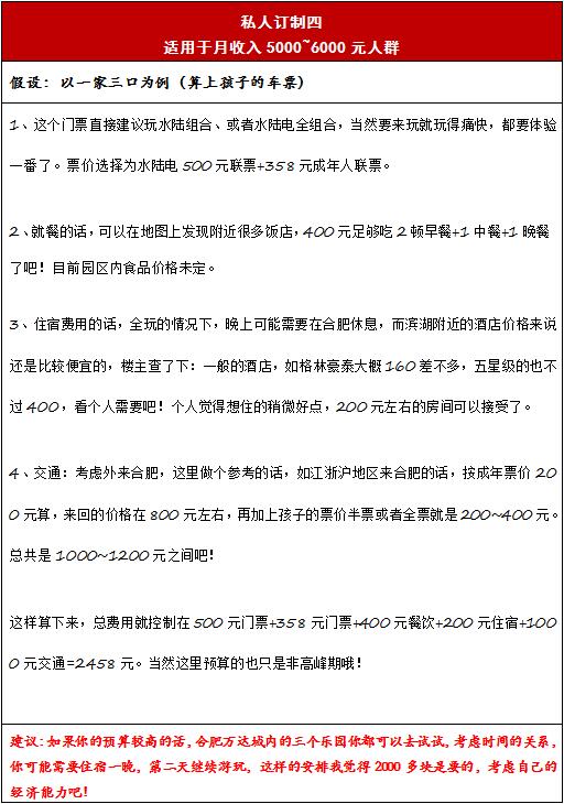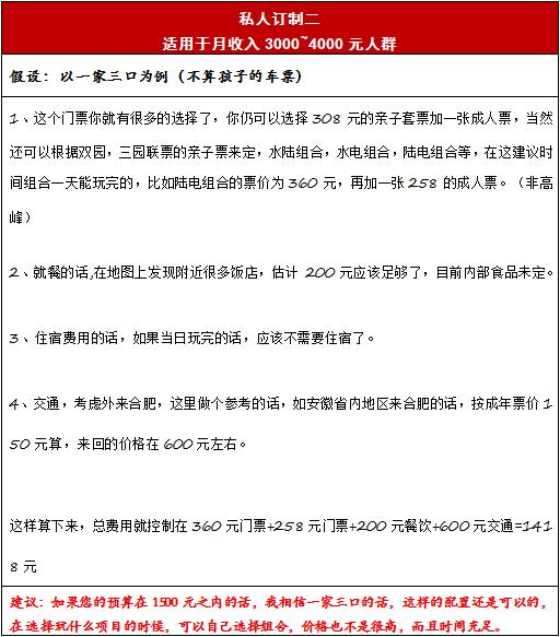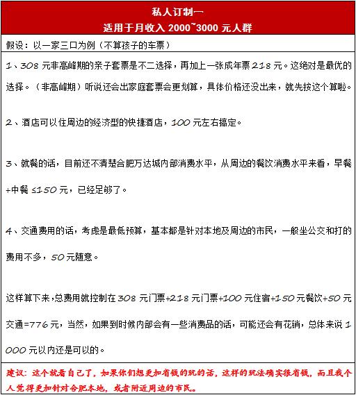 十分期待9月24日的开幕,我就可以去浪了,额……口误!是带着宝宝和老婆去浪了。 估计很多网友都会跟我一样的想法:来合肥玩一次的价格应该不止是门票,其他的东西那么多,到底我要花多少钱才行啊?咱玩归玩,但是也要考虑下自己的经济收入啊! 别着急,所以我偷偷做了下功课,整理了一份游玩攻略,可以根据自己的经济能力来玩,以月收入来推荐一些玩法:2000~3000、3000~4000,4000~5000等预算,不过土豪请自动屏蔽此攻略,土豪请随意玩,咱这精打细算的攻略算是一种私人订制吧! 钱都在老婆那,不得已在这里我制订的是【一家三口】模式,顺便还给大家做了最低的预算。 私人订制宝典 交通来说如果你是自驾过来的话,你可能就不需要打车的钱了,当然油费还是要出滴!那么从合肥市内去合肥万达城的交通费用呢? 合肥火车站 37元, 当然这只是百度地图给的打车参考 现在那么多的打车软件相信也不要这么多。 合肥南站 25元, 同上。 新桥机场 84元,这个不好说 如果能够打到车的话,价格应该差不多吧 另外的话,如果坐机场大巴的话 再打车可能会因为转车有点麻烦 但是价格上可能会便宜将近一半。 (备注:以下档级以月收入划分)