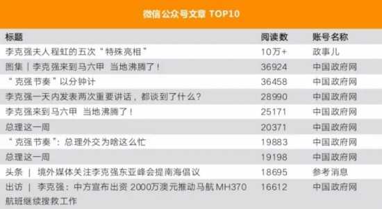 在微信公众号的文章中,阅读量排名第一的是这篇:《李克强夫人程虹的五次“特殊亮相”》,网友们开始八卦总理夫人啦~该文梳理了自2014年5月首度亮相以来,程虹的五次陪同出访。这五次访问中,一贯低调的程虹以知识女性的形象,给各国留下了深刻的印象,被赞为李克强的“软实力”。