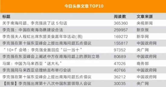 再来看今日头条,阅读数TOP10的文章中有半数聚焦南海问题,详细解读李克强总理在东亚峰会上针对南海问题提出的五点倡议。