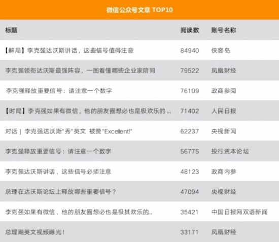 总理此次出访,引发广泛转发的微信公众号推文有两类:一类跟“一个数字”有关,总理分析了GDP增长7%的含金量,GDP基数在增大,即使7%增长,年增长也要达到8000多亿美元,大于几年前10%的增量。此类文章被转发38次,总阅读数高达34万。另一类跟“总理朋友圈”有关,“中国日报网双语新闻”想象了总理的微信朋友圈和达沃斯群聊内容,幽默贴切,令网友脑洞大开,共有 “人民日报”等近八十家公众号转载。