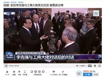 另外,总理在达沃斯说英文的实拍视频也被大量围观,相比高大上的会议日程,网友们更加关注国家领导人语言的国际化。在优酷网上,《实拍李克强与工商大佬英文对话 被赞英文棒》的视频点击量高达300万,《李克强在世界经济论坛年会上发表特别致辞》视频则不到40万点击。