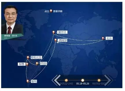 二、绕行地球一圈多 总理机智应对音响故障 李克强出访拉美四国 2015年5月18日-5月26日 此访不仅是李克强就任总理以来首访拉美,其出访行程也创下了时间最长、行程最远、途经国家和城市最多的“三最”。加上经停国,李克强此行将走访6个国家、7个城市,历时13天,飞行5万多公里,相当于绕地球一圈还多。