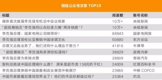 60多个小时的超长空中行程,带火了总理专机,在拉美之行相关的微信公众号推文TOP10中,“央视新闻”的《媒体首次披露李克强专机空中会议场景》名列榜首,它图文并茂地展示了总理的“高”端会议和云上生活,成功抓住观众们的好奇心。