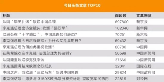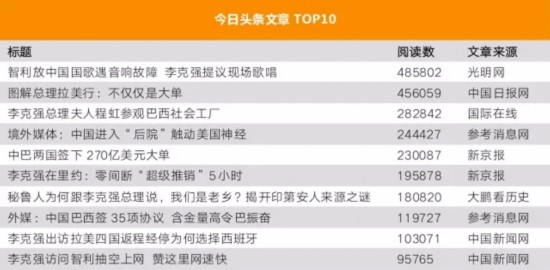 今日头条上阅读数最多的文章是《智利放中国国歌遇音响故障 李克强提议现场歌唱》,阅读数近50万,机智如总理啊!大家自行脑补现场情形……