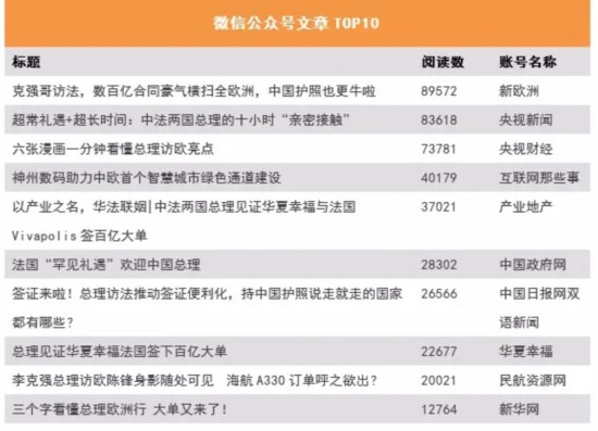除了政治和经济,诗酒、文学、历史、企业精神等文化领域也是总理出访拉美的新媒体关注热点。 三、史上最Q总理漫画 李克强出席第十七次中国欧盟领导人会晤并访问法国 2015年6月28日-7月2日 据新榜统计,总理年中的法国之行并没有产生10万+的“爆款”微信公众号推文,在阅读数TOP10中,主流时政媒体与行业新媒体平分秋色。 其中,一家名为“新欧洲”的欧洲中文网站,突出报道法国对中国公民放宽签证政策,排名第一。相关主题的公号推文共有14篇,近13万次阅读,更多小伙伴可以愉快地去法国玩耍啦!