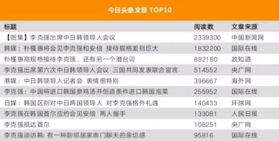 相比而言,今日头条上的热门文章则把关注重点放在了中日韩关系上,有两篇文章阅读数超过百万。朴槿惠会见李克强和安倍,接待规格差别巨大,反映出陷入低谷的日韩关系和进入深度发展“快车道”的中韩关系,鲜明对比引发中外媒体热议。