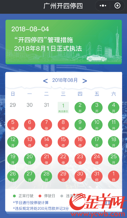 图/黄巍俊摄 金羊网讯 记者付怡报道:广州“开四停四”正式拍摄执法已经进行了四天。根据广州交警的统计,1日共有25万台非广州市籍中小客车进入管控区域,今天,也许就会出现首个因违反“开四停四”而被罚的案例。对于违反“开四停四”的行为,交警部门将按产生违法行为的自然日数量计算车辆违法行为次数,每辆车每个自然日处罚1次,处200元罚款,记3分。 此前,为让市民熟悉“开四停四”管控措施的规则,7月为执法过渡期,只拍摄记录车辆的违法信息,而不作处罚。据统计,7月5日0时至中午12时,广州全市电子警察设备监测到违反通告的非广州市籍中小客车3万多辆,其中黄埔大道西暨南大学路段为违规车辆出现最多的路段。今日正式开罚,且恰逢周日,违规上路车辆相比上月同一时间理应有所减少。 那么,车主如何掌握自己的违规情况呢?对此,有市民就建议,外地车在限行日进入管控区域时,交警能否即时向车主发送信息提醒以最大限度减少“误闯”被罚? 广州交警表示,正式拍摄执法后,违规车主将收到通知,车主需要在通知的时间内去车管所或交警队处理罚单。但交警并未回应车主会在违规后多久收到信息以及需要在多久之内处理罚单。 另外,广州交警推出了“开四停四小助手”微信小程序,车主可在出行日期上点击,程序会显示该日期是否违规以及接下来限行的日期。有市民反映,目前“开四停四小助手”还不能与车辆信息绑定,实现车辆整体出行计划的计算,车主需要每天在小程序上“打卡”,如果忘了某个日期是否上过路,就无法规划接下来的出行。广州交警就此表示,8月中旬“开四停四小助手” 将实现个性化定制,自动根据车辆行程记录进行出限行计算,并结合管控区域定位查询,让车主更方便规划出行。