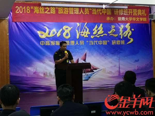 金羊网讯 记者孙唯、实习生豈焕摄影报道:8月7日上午,海上丝绸之路沿线国家旅游管理人员“当代中国”研修班——出入境及警务人员班在暨南大学华文学院举行开营仪式,这是本年度暨南大学面向海上丝绸之路国家开设的“当代中国”系列研修班的第二期。