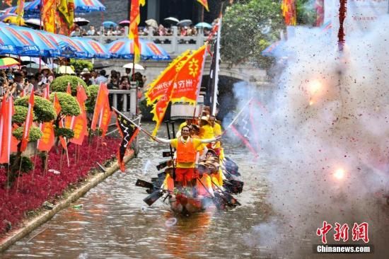 6月18日,广州猎德村举行端午龙舟胜景活动,吸引了大批民众驻足观看。当日,广州百余条来自天河、海珠、番禺等地的各色龙舟游经猎德涌庆贺端午节。中新社记者 陈骥旻 摄