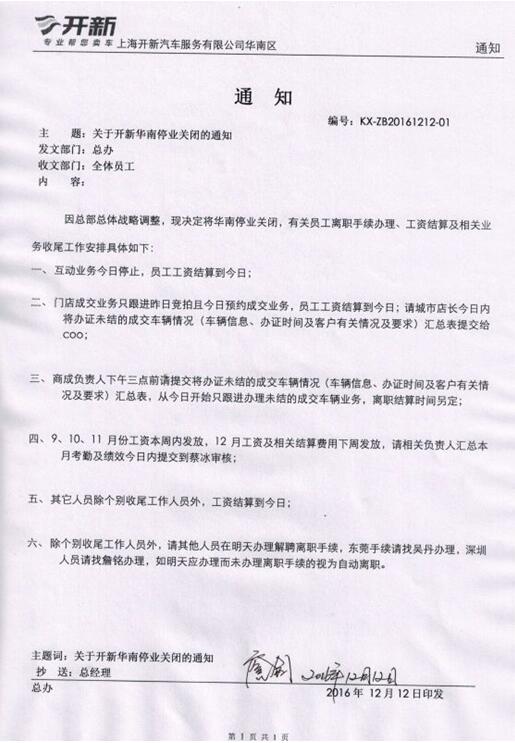开新二手车关闭华南片区内部信和企业全部分城市图 加之,11月30日,开新二手车方面宣布和上海大众达成战略合作,在开新发布的新闻通稿中显示:“帮助上海大众经销商和车主更好更快地处理旧车,让上海大众品牌和经销商更专注于服务客户。”从措辞中,不免让外界产生开新二手车接触B2B的遐想,因为新车销售到二手车置换需求,是一整套产业链,现在由上海大众接手C端业务,开新服务于B。不免让人想起此前,北汽接盘车易拍的跨界整合先例。 北汽产投投资部先前发布一份投资报告,认为汽车后市场跨界整合或成常态,尤其在二手车业务、共享出行模式等在饱受争议的同时正深入人心,为跨界整合创造了条件。去年3月,贝雅公司(Robert W. Baird & Co.)旗下私募股权基金贝雅资本对开新进行A轮投资。当时,开新创始人林哲放下豪言,这笔融资将会用来进行市场扩张,计划“未来一年内在9个城市新开30家门店。“ 时隔1年半,开新未有任何资方的助力,城市分布不增反减,与林哲的愿景背道而驰,这加重了外界对于开新二手车经营困难的设想。另有观点认为,林哲主张城市扩张战略,而如今华南片区整片裁剪,很可能资方对于开新的战略也出现了挟制的措施,与上海大众的跨界整合仅仅是开新业务线收缩的第一步。 另一方面,此次放弃整个华南片区,开新二手车内部也或出现联动的人事地震。各城市分总、分城市市场经理、运营等成体系的人事构架,将出现牵一发而动全身的窘境,由裁剪华南片区引发的运营和业务流混乱,二次离职潮也不可避免。这对于资金紧张的开新二手车而言,或将是第二轮冲击。 这不禁让人联想起,一篇今年刷爆创投领域朋友圈的文章《裁员!裁员!创业者们的2016“寒冬大逃杀”》,文章讲述,机会和死亡仅差一步之遥,创业者每一个决策都可能伴随着企业的下一秒是否死亡。不可否认,在二手车交易旺季的年底,裁剪现有城市数量,对扩张和投放极为谨慎,这是典型的资金危机的表现,开新二手车放弃华南这样的车源保有量,以及限迁政策解绑惠及地,这足以说明包含了多少无奈,是一种放弃竞争的被动选择,对业务量下滑和亏损的城市,只能进行调整,其中就包括关闭站点。 企业的资金困难,和内部的运营、管理有不可分割的关系,然而运营和管理的积累也非一朝一夕之功,所谓“千里之堤毁于蚁穴“,开新二手车有一些内部运营上的苗头问题早已在各类曝光类网站上出现。 其中包含,战略不稳定,以及工资拖欠等硬伤。在小米、华为内部管理层流传着这样一句话,“底层运营体系的频繁调整,通常是来弥补企业战略失误的“。