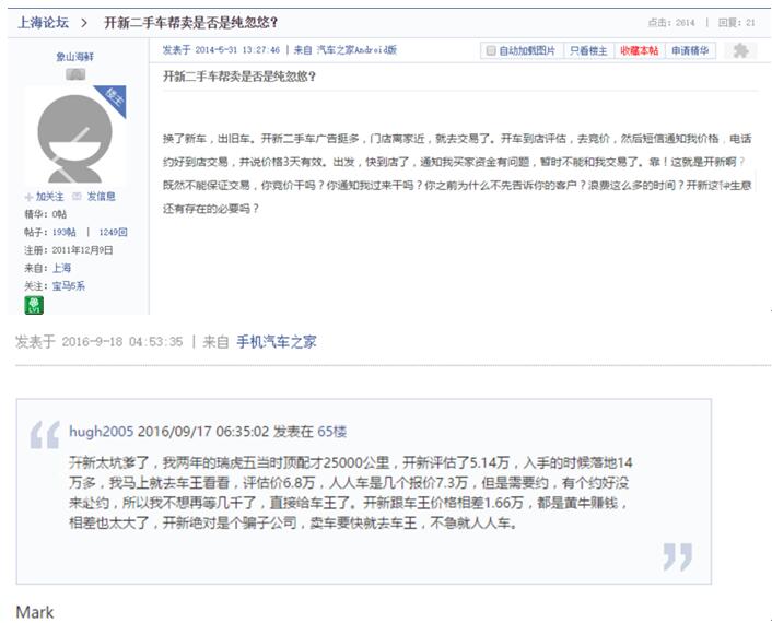 某著名企业爆料平台内部员工的点评 除了内部管理和团队问题外,开新二手车对C端用户的服务、以及交易流的问题,也频频出现在各大汽车论坛上。