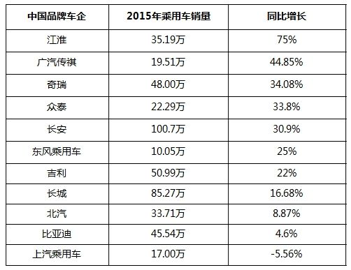 原标题:2015哪些车企靠SUV领涨?高增长中国品牌盘点 2015年汽车销量终于出炉,数据显示,全国乘用车销量2114.63万辆,增长7.3%,与前几年相比大为缩水。其中,中国品牌在过去一年成绩抢眼,基本上完成年度销量目标。按增长速度来看,绝大部分中国品牌增长均超过乘用车7.3%的水平,长安、奇瑞、广汽传祺等增长均超过30%,而江淮更是以增速超75%成为增长最快的车企。按规模来看,长安、长城等销量甚至超过合资车企。