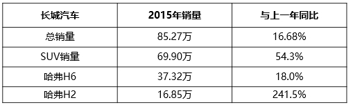 长城汽车在2015年度总销量虽然不是第一,但其去年全年累计销量85.27万台,同比增长16.68%,超额完成销售目标。过去一年,长城汽车稳稳抓住SUV市场的机会,哈弗系销量达69.90万台,为母品牌贡献八成销量。