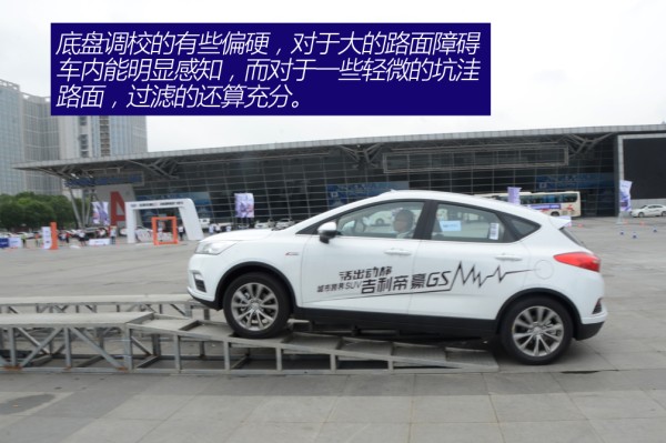 帝豪GS使用了非独立后悬,这在同级别也是主流配置。可能被戏称为“板车”的非独立后悬会惹得观众心存芥蒂,不过其成本就摆在这,也无可厚非了。帝豪GS整体的底盘调校偏硬,在过图中这样的类似阶梯路面的时候,表现还是挺明显的,路面大部分信息都会传入驾驶室,你也能清楚的感知其底盘的整体性很不错。不过对于一些小的坑洼路面,底盘还是能给于很好地过滤,保证了一定的舒适性,而这种“硬并非生硬”的底盘状态也绝非大家口中的“板车”了,帝豪GS的底盘调校功力还是不错的。