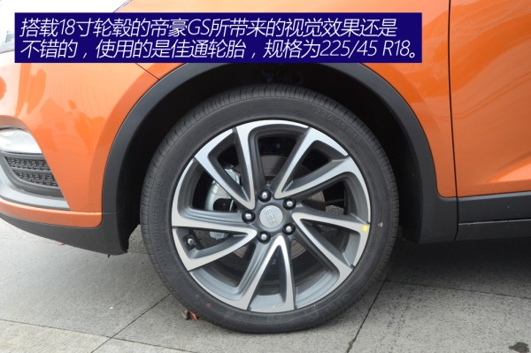 搭载18寸轮毂的帝豪GS所带来的视觉效果还是不错的,使用的是佳通轮胎,规格为225/45 R18。运动版车型还使用了红色卡钳,进一步提升其战斗氛围。