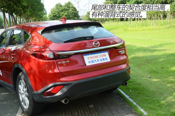 尾部和整车的契合度相当高,有种溜背式的感觉。前后保险杆以及车侧都使用了黑色摩擦材质,为新车增添野性的同时也增加了一些时尚元素。双边共双出排气也让CX-4气势十足,同时它的尾部还提供了4颗雷达探头以及一颗倒车影像摄像头。