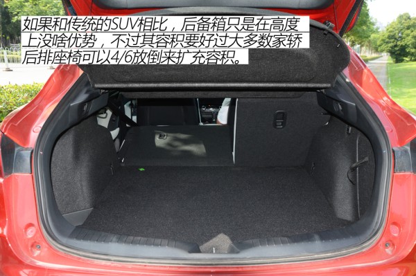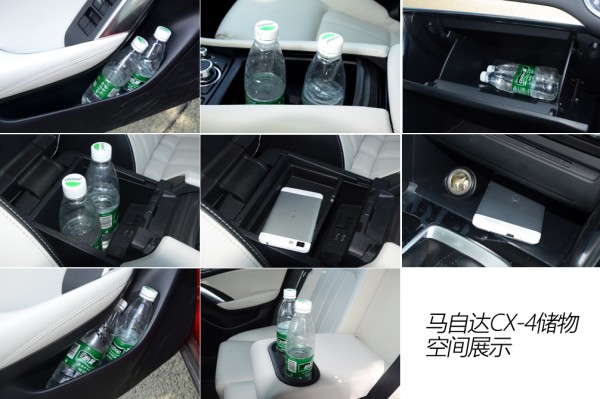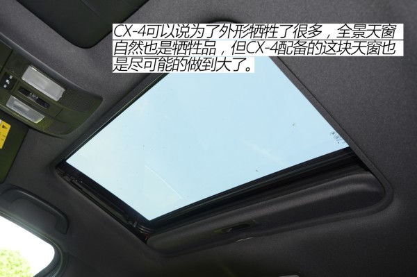 ●空间解析 身高173cm的体验者在CX-4前排得到3指的头部空间,后排头部空间为1拳,腿部空间为2拳,整体空间表现满足家用足够,在同级别SUV中,这样的表现显然是没有什么话语权的。这也不难理解,尽管CX-4车身数据还算不错,要知道这是一台主打颜值+操控的另类SUV,必须得牺牲空间来换取外形了,因而对于空间有较大需求的朋友来说,这台帅气的CX-4或许并不适合你。