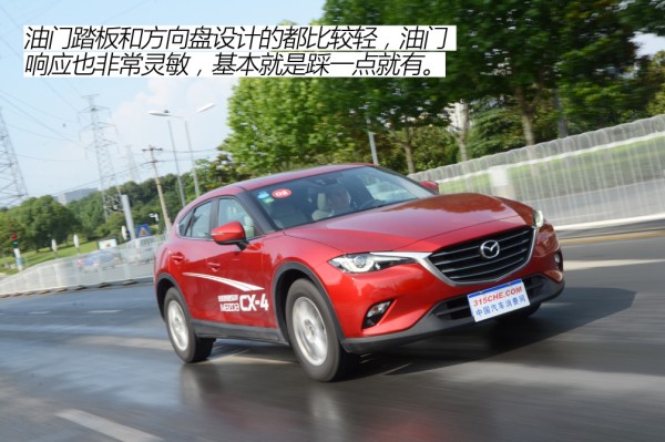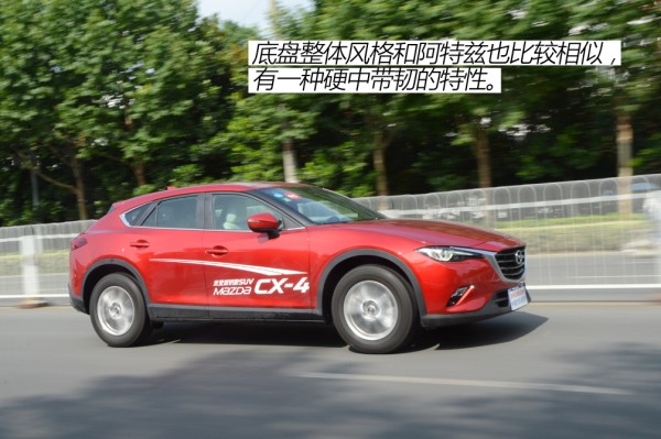底盘采用的是前麦弗逊、后多连杆结构,整体风格和阿特兹也比较相似,有一种硬中带韧的特性。对于一些碎石以及小的起伏路面,则能起到一个很好的过滤作用。面对一些坑洼路面以及大的路障,CX-4则会将大多数信息都传递到驾驶席。对于把舒适放在第一位的消费者来说,CX-4可能也并不太适合你。当然,这种略偏于运动化的底盘调校以及较低的车身设计,使得CX-4在抗侧倾方面表现的比传统SUV强很多。