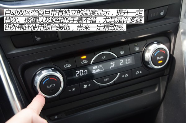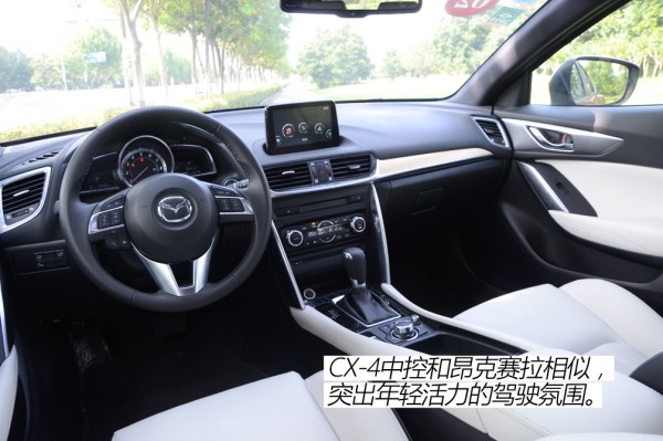 ●内饰解析 在两种家族内饰的选择上,CX-4确实聪明了一把,毕竟阿特兹、CX-5那种内饰太老气了,也一直受人诟病,完全衬托不出CX-4所展现出来的年轻活力。CX-4使用了和昂克赛拉相似的中控造型,采用了独立的悬浮屏设计,确实要年轻不少。