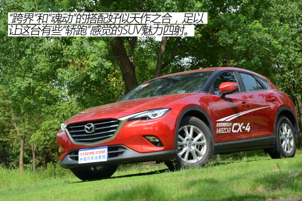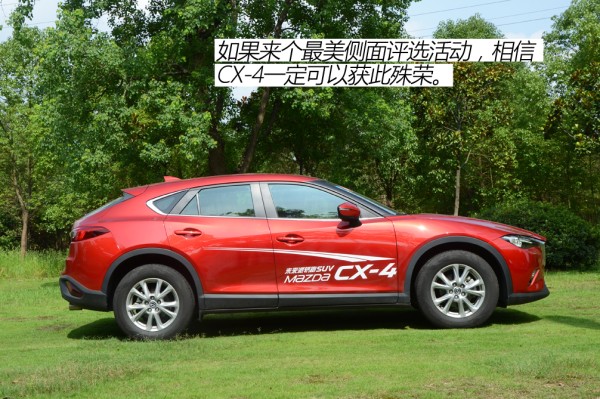 CX-4是在CX-5平台衍生出来的细分车型,定位紧凑型SUV,如果说魂动设计只是给CX-5规矩、传统的SUV增添一点美色的化,那么同样家族化的设计无疑让CX-4魅力四射。即便魂动设计早已出现在马自达旗下大多数车型上,看到CX-4那一刻,我依然可以用惊艳来形容。