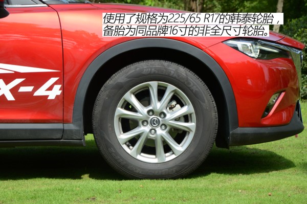 CX-4为2.0L、2.5L两种车型提供两种不同的轮胎规格。2.0L车型为17寸,2.5L车型为19寸。匹配CX-4这样的车型必然是19寸轮毂要更骚气,视觉冲击力强多了,但这仅限于从外形方面来说的。使用效果我倒更倾向于17寸轮胎,毕竟CX-4底盘调校就有些偏硬,在加之19寸轮毂胎壁较薄,不说爆胎、鼓胎机率较大了,舒适性方面也会打一定折扣。