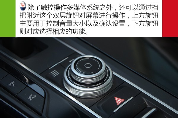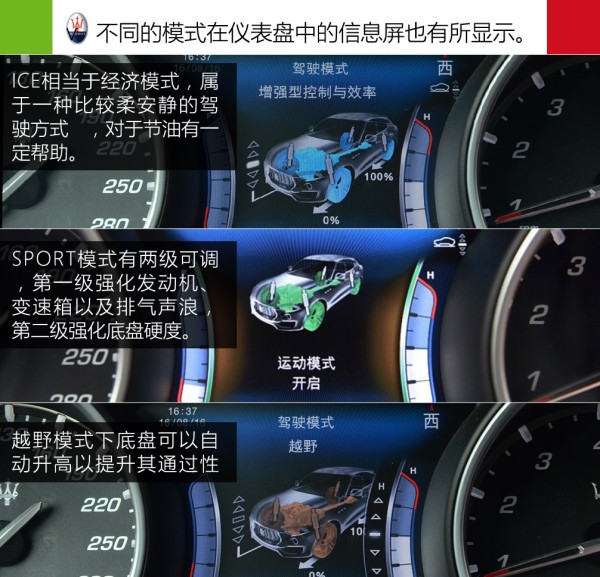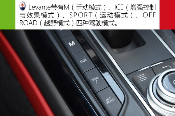 Levante带有M(手动模式)、ICE(增强控制与效果模式)、SPORT(运动模式)、OFF ROAD(越野模式)四种驾驶模式。其它模式都比较好理解,在这里解释下ICE模式,通俗点说就是一般车型上的经济模式,讲究舒适惬意的驾驶氛围,同时对燃油经济性也有帮助。按下SPORT按键,Levante车身底盘会降至最低,以确保其更低的重心以及风阻,以此来增强操控性。而在OFF ROAD(越野模式)模式下,底盘会自动升高以确保其通过性。需要进一步说明的是,SPORT模式有两级可调,第一级强化发动机、变速箱以及排气声浪,如果再按一下SPORT按键,它将进一步强化强化,此时才会达到Levante的“最强模式”。