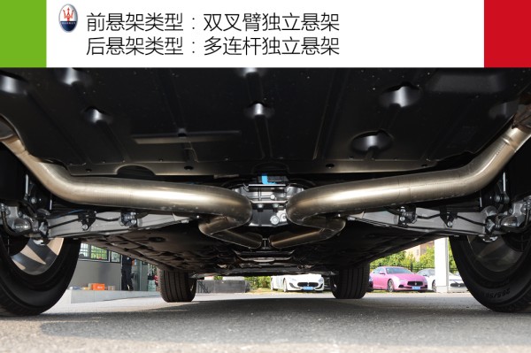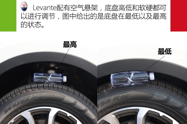 Levante使用了前双叉臂、后多连杆的悬架类型,且带有空气悬架,底盘高低和软硬都可以进行调节,下图中给出底盘调至最低以及最高时的状态,大概目测底盘最低状态和最高状态间差距大概在8cm左右。