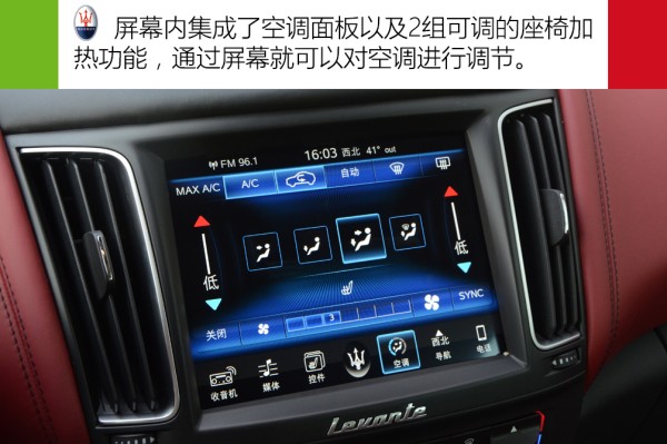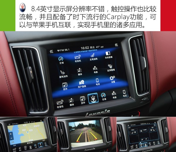 Levante使用了一套全新的MTC+多媒体系统,抛弃了Ghibli和总裁上那种老旧的人机交换系统,绝对是个与时俱进的做法。多媒体系统显示端是个8.4英寸的电容屏,分辨率不错,触控操控也比较流畅。除了常规的影音播放、导航、倒车影像等功能外,像座椅加热、空调面板等诸多功能都被集成在这块屏幕内。此外,新车还配备了时下流行的Carplay功能。