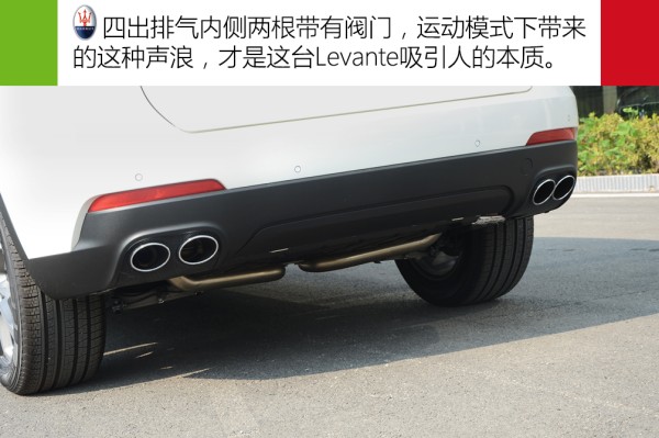 Levante尾部流线感很强,有些轿跑车的感觉,配备霸气的双边共双出排气,营造出极具跑车的动感造型。这样的流线设计加之主动格栅等细节辅助,让这台SUV的风阻系数仅为0.31Cd。作为一台架在SUV上的跑车,Levante跑车元素不仅体现在外形上,它的四出排气内侧两根带有阀门,平时阀门是关闭状态,在运动模式下则被激活,而此刻你就尽情地享受它带来的声浪刺激吧。