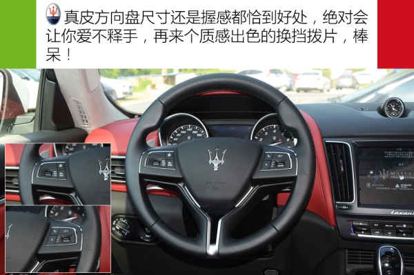 三幅式真皮方向盘不管是尺寸还是握感都恰到好处,方向盘支持4向电动调节,并且配有质感不俗的换挡拨片,如果你有着强烈的驾驶欲望,相信这台Levante也一定能满足你。方向盘左侧按键主要开启定速巡航,左侧上方的那个空白按键是用来选装更高级一点的自适应巡航功能(当然你需要额外花费2.5万RMB),而右侧按键主要用来控制多媒体系统。