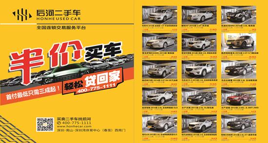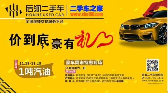 11月份在深圳后河二手车,所有7年18万公里且3-50万的车型都可以参与半价购车活动!价到底豪有礼,众多优惠正在进行时! 精彩活动劲爆来袭 一吨汽油引爆底价购车风暴 深圳后河二手车为答谢新老顾客的大力支持,在2016年11的每个周末,再次推出了更为劲爆的每周末购车特惠专场活动和月度答谢活动。首先,进店就有礼:到店即送后河二手车标识的手机支架;其次,订车就送礼:订车即送1000元次年保险基金(适用于11台ABB车型);另外每周特惠活动惊爆你的双眼:所有7年18万公里且3-50万车型都可以半价购车!再次,后河二手车还将在11月19日至20日更将举行史无前例的“一吨汽油引爆底价购车风暴”活动,神秘大礼等着你!具体信息小伙们可以通过深圳后河二手车官方网站(www.honhecar.com)了解或直接到深圳湾体育中心(春茧)西南门后河实体店体验咨询哦。