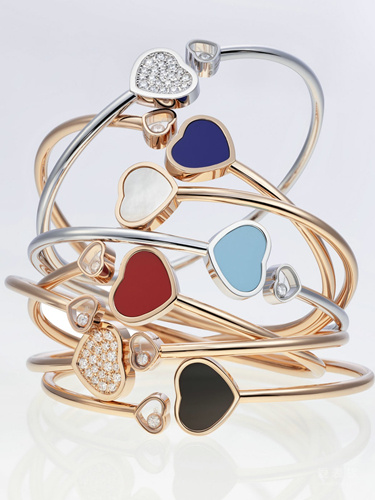 今年,萧邦以全新方式演绎Happy Hearts系列。缤纷色彩绚丽登场:绿松石、缟玛瑙、珍珠母贝、青金石或钻石之心与传统的镂空心形坠饰相映成趣,交映生辉。系列的主打作品是一款全新手环,其两端分别点缀一颗彩色心坠和一颗内含旋动钻石的心坠,两两相望,演绎一阕优雅的双人舞曲。