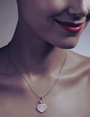 Happy Hearts作品在精致的白金或玫瑰金链条之上点缀硕大的镂空心形坠饰及内含旋动钻石的小巧心坠。轻柔的珠宝结合旋动的钻石和随意洒脱的图案,缔造出独特而时尚,极具女性风情的珠宝系列。