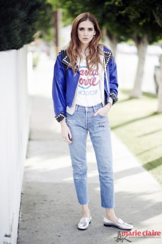 时尚博主Chiara Ferragni 身穿铆钉夹克内搭印花打底衫,下配毛边儿牛仔裤街拍。 Tips: 1. 铆钉夹克具有强大的美观性和实用性。 2. 建议与仔裤相搭,穿出型格感。 推荐搭配