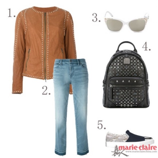 1. 铆钉夹克:DROME $1,509.39 2. 裤子:TORY BURCH $300.08 3. 配饰:VERSACE $228.62 4. 背包:MCM $1,973.34 5. 鞋子:MYSWEAR $610.04 |