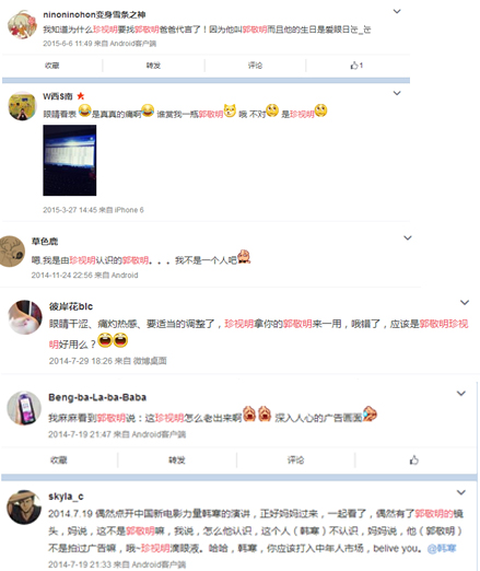 以至于珍视明滴眼液的消费者,还会戏称:郭霸霸的珍视明!不得不说,舆论正面爆发就是品牌在新媒体营销的最佳表现!而早在2010开始,珍视明与郭敬明通过电影跨界营销为媒介,打通线上线下传播通道,从而让珍视明成为新媒体运营的大赢家。因此,珍视明牵手郭敬明的一系列广告营销都堪称经典,其给品牌方带来的巨大的商业利润也不在意料之外。 成就明星、广告商的经典“双赢”! 纵观国内代言界,比许晴和露露13年缘分更长久的,是娃哈哈和它的代言人王力宏。从1999年开始,王力宏就为这个全中国驰名的饮料品牌做代言直到今年,双方已经携手合作了16年时间。 而珍视明选择郭敬明的价值,历经时间考验证明,已远超其他明星。从青少年群体的号召力来看,郭敬明不仅是80后青葱时代的代名词,更因《小时代》电影4部曲,快速占据全国90、乃至00后的青春共鸣高地。同时,由于郭敬明本人对文学IP商业运作的可圈可点,但凡代言品牌,字句之间,都媲美4A级别文案准线,从珍视明经典广告语就可见一斑。
