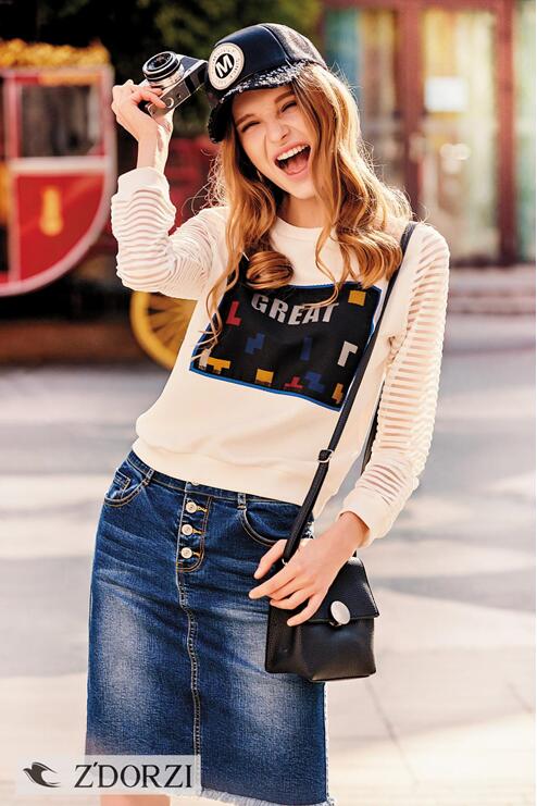 标语口号衫是2017年一大主要流行单品,帅气休闲的Slogan Top混搭甜美浪漫的裙装正好迎合当下最In的的Femleisure风潮。胸口处鲜明又个性的图案让你轻松抓住全场目光,酷帅又时尚,袖臂处的透视拼接却又为你增添少女气息,两者混搭得恰到好处,干净利落。搭配单宁蓝牛仔半身裙让前卫和优雅感并存,这种MIX的穿法是今年最in的哦。