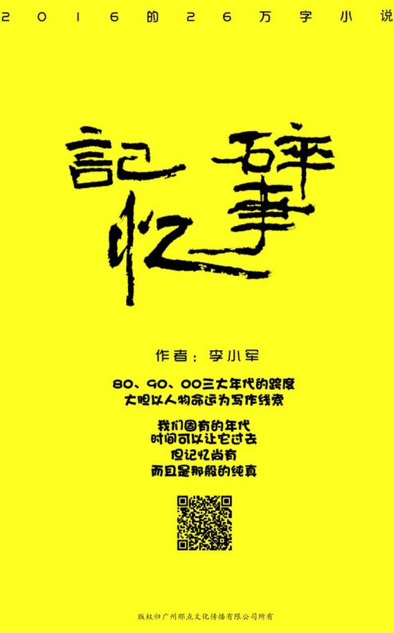 《碎事记忆》作者生活照 《碎事记忆》作者笔名土长, 原名李小军:甘肃渭源人,27岁,毕业于广东财经大学艺术学院,从事过媒体采编、影视后期,拍摄过纪录片《家年》《关爱白血病儿童公益宣传片》。如今生活在广州,和同学创办那点文化传播公司,主要从事策划、剧本创作工作。其中编剧的文艺电影《离家出走》,剧本已完稿。《碎事记忆》是作者的第一部长篇小说。 以甘肃定西一农村为创作背景,整个小说时间跨度80、90、00三个年代,主要以农村各类家庭的人物命运为创作线索,围绕两代人,父辈与我们这一代。其形态上主要在展露过往的岁月里,王咀村各类人等的言行举止、喜怒哀乐、他们身上有着共同的特点“庄稼汉”。他们学识不高,但可以畅谈国家大事!他们没有远大目标,只求风调雨顺。一些看似不高雅,一些看似黑色的幽默,一些农村人实实在在的生活写照。揉和下一代跳出农窗者的感受与看法!去记录曾经王咀村有过的日子!有过的黑幽默!有过的家长里短! 改革的三十年是农村变化发展的三十年,一个村子各类人等都在随着变化过活着。有村长、有普通家庭、有为了生个儿子,忍痛丢弃女儿的家庭、有光棍、有阴阳先生。无论惯有的身份怎样?他们都是“庄稼人”。 渭河水依旧,王咀村人的日子依旧。下棋、喝酒、吵架、闲谝种种碎事依旧。而今,新一代王咀村人,对那段发生的碎事却成了一种记忆,碎事碎到吃喝拉撒、碎到香港回归、碎到“一国两制”、碎到“非典”、碎到村长选举,碎到这些曾有的岁月。 《碎事记忆》我们固有的年代,时间可以让它过去,但记忆尚有,而且是那般纯真。 |
