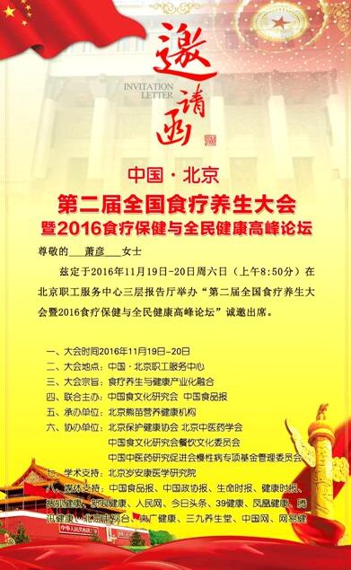 一年一度的由中国食文化研究会、中国食品报联合主办的”第二届全国食疗养生大会暨2016食疗保健与全民健康高峰论坛”于11月19日在北京职工服务中心拉开帷幕。 据悉,本届食疗养生大会暨食疗保健与全民健康高峰论坛的主旨方向是:贯彻学习2016全国卫生与健康大会会议精神;解读剖析“健康中国”全民健康发展思路;“食疗养生与健康产业化融合”;“汇聚全国食疗优势资源推动产业化发展”。本次大会将邀请全国400多位健康食疗养生专家学者参会,将从“报告、学术、分享、创业、对话”五个方面进行深入剖析,将食疗行业“产、学、研、创”等方向联合“专家学者、企业家、创业者、消费者”汇聚于此次大会,共享食疗盛会无限价值。