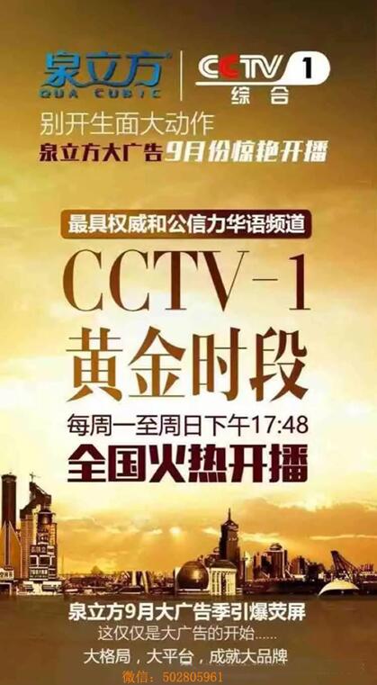泉立方2016全新战略部署拉开帷幕,新模式,新渠道,每年1.8亿元广告投入,想赚钱的,都别掉队! 泉立方15秒硬广. 9月份开始在CCTV-1闪亮登场; 每周一至周日下午17点48分,全国火热开播记得收看!!