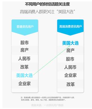 此外,与整体用户关注股市、房产不同,股市资讯并不是高端人士的关注重点,其反而对美国大选的兴趣更加浓厚,体现了精英阶层对于时政资讯的偏好。