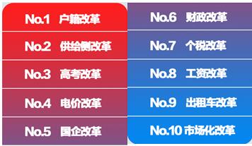 “改革”相关资讯反映用户需求 户籍改革最牵动消费者之心 2016年是深化户籍改革、解决城镇化难点的关键之年,作为今年两会核心热点之一,“户籍改革”显然最牵动消费者之心,在改革方面的资讯关注榜上排名首位。除此之外,供给侧改革、高考改革、电价改革等民生层面热点也纷纷上榜。 最受关注的“改革”话题Top 10