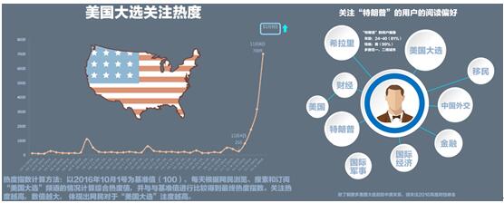 关注“特朗普”的用户中男性用户高达99% 作为今年全世界的焦点,一点资讯根据网民浏览、搜索和订阅“美国大选”频道的情况计算综合热度值,得出“美国大选”的实时热度指数。指数显示,网民关注度伴随投票日的临近不断上升,并在选举直播当天达到顶峰。 聚焦赢得此次选举的“特朗普”,一点资讯为关注川普的用户量身定制了颗粒度画像。画像显示,在一、二线城市,20-40岁用户占比约为81%,男性用户高达99%。此外,关注“特朗普”的用户也同步关注希拉里、中国外交、国际经济等话题。