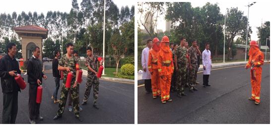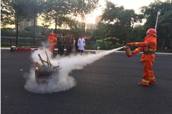 图为:水带一带一枪抛收及现场救护演练 2、消防灭火器的使用及讲解,现场实操示范灭火: