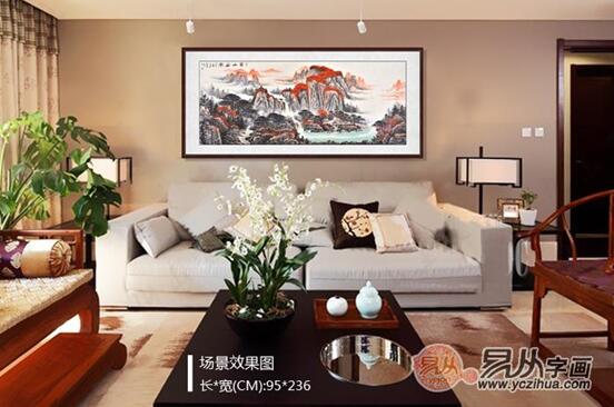 客厅风水画 蒋伟山水画聚宝盆作品《富山居图》 作品来源:易从网 【点评】装饰画在色彩把握上要与整个空间的色调一致,多以明快清丽的色调为主,使人感觉舒服才是王道,太深太刺眼的色调,短时间内可能觉得绚丽养眼,但长时间的话容易让人心情沉重,情绪紧张。这一幅客厅装饰画效果图就是最好的诠释。 此幅作品蒋伟老师用渲染手法,突出祥云环绕,满山红遍的宏大景象,远处山峰层层叠叠,枫林披覆,一片火红,脚下江水悠悠,碧绿清澈,大地理风水格局讲究的是左青龙、右白虎、前朱雀、后玄武,画面构图远虚近实,近景突兀、远景清雅、墨气明润,浓淡虚实相生。此幅作品画卷生机勃勃,流溢着生命的激情,跳动着生命的神韵,对自然精神的观照。 五、室内装饰画之(最写意) 有人喜欢金碧辉煌的装扮,就有人喜欢素雅清淡的生活;有人喜欢富贵多金的装扮,就有人喜欢低调奢华的平淡;有人喜欢清爽亮丽的装饰,就有人倾向于写意雅致的点缀....自小便偏爱写意山水的云中鹤的家就是沿袭古典雅致的装饰方法,古色古香的家具,茶具,与同样写意雅致的山水画相映成趣,其中意味自在其中!