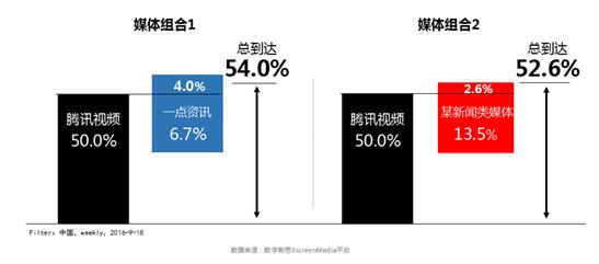 同时,谭北平也提到:“APP活跃并不是全部,通过社交分享、浏览器、预装、外部APP等流量入口,媒体应在APP活跃之外产生生态流量,这才是媒体的真实价值。”而一点资讯在自有APP外,还获得了小米与OPPO的全线产品预装,以及浏览器的全流量支持,这也正赋予了一点资讯丰富的生态流量。 优化的媒体组合不仅需要选择生态流量大、渗透高的媒体,还要考虑媒体间的重叠,选择独立增加到达高的媒体,这样才能实现最好的传播效果。谭北平提到:“以腾讯视频为例,如果与一点资讯进行组合投放,能够实现更高总到达率。同时,一点资讯对视频和社交媒体的增加到达能力更强。”