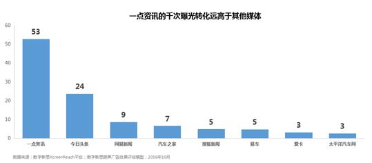 【行为连接背后的广告效果价值】 关于一点资讯广告效果监测,谭北平提到了连接行为来确定兴趣引擎效果的的方法。 首先是连接曝光与行为,定位到一点资讯广告曝光所触达的用户群体,分析该群体在一点资讯之外的媒体行为是怎样的,以此来判定一点资讯广告是否触达了有效用户。而在2016年10月一个关于汽车的广告监测中,一点资讯兴趣引擎覆盖用户的精准度有12倍,远高于其他媒体平台。 其次,在同一个活动中,一点资讯的千次曝光带来的后续的直接和间接转化有53次,同样远高于行业其他媒体平台。最后,在提高效果转化之外,除了用户兴趣,在广告的排期、频次和创意上仍有很多优化空间。而这方面,一点资讯的日均频次接近最优,转化效率最高。