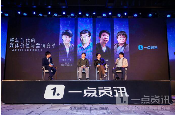 知名音乐人李泉(左)与一点资讯营销项目顾问梁星宇(右) 【亮点七:专家学者眼中的媒体价值与营销变革】 圆桌互动环节,在一点资讯全国营销中心总经理于正的主持下,“新闻老兵”陈彤,与专注新闻传播学术研究的专家学者喻国明教授、刘德寰教授一起,共同探讨了移动互联网时代技术与内容的关系。 关于这一问题,喻国明老师提到:“内容作为一种技术或媒介,能够构筑场景、平台,具有把需求跟供给汇接在一起的特点。而大数据精准的用户洞察和计算能力,是内容成为媒介的技术基础。” 谈及内容分发的人工智能,陈彤提到:“无人工不智能,一点资讯价值阅读的实现,正是基于优秀算法团队和优秀编辑团队的有机结合,技术与内容的统一使得价值阅读成为可能。” 同时,刘德寰老师也认为:“以推送为核心的新闻客户端崛起后,社会由原来的内容为王转向偏好为王。但技术的好坏仍由人性所决定,一点资讯倡导的价值阅读正是尝试通过技术与内容结合来解决这一问题。”。
